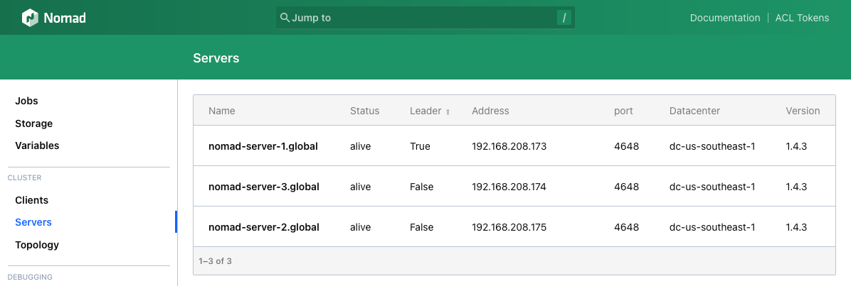 in your browser.Use the left-hand menu to navigate to the Server page to see a list of the Nomad servers deployed in the cluster: